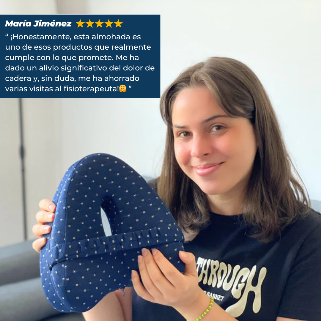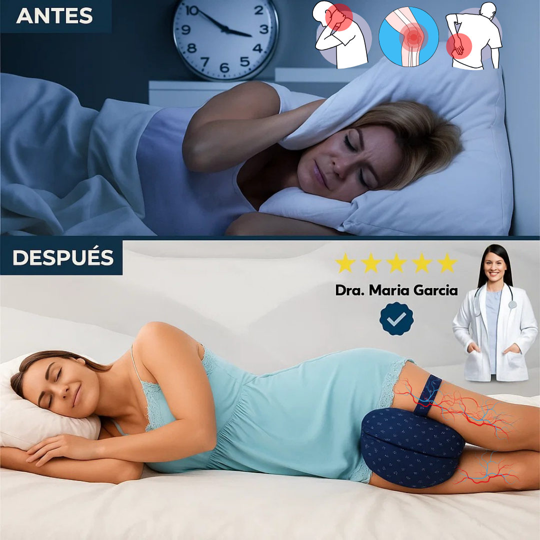 Nuestra Almohada Ortopédica evita la compresión del nervio ciático al mantener tus piernas en la posición ideal. Reduciendo la tensión e inflamación lumbar, y previniendo el dolor y mejorando el descanso.